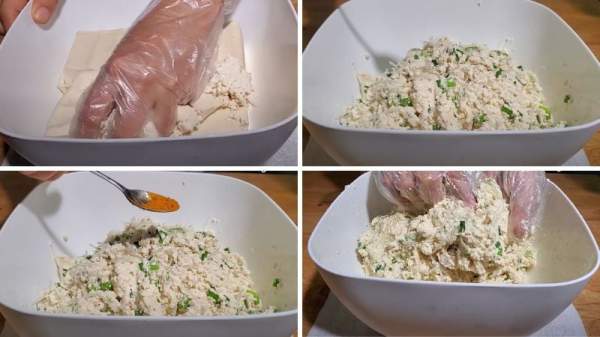 Bạn cho đậu hũ trắng vào trong 1 thau lớn, dùng tay để bóp nát những miếng đậu hũ. Sau đó, bạn nêm nếm những gia vị gồm: 2 muỗng cà phê muối, 3 muỗng cà phê hạt nêm, 1 muỗng cà phê bột ngọt, 2 muỗng cà phê tiêu xay rồi tiếp tục trộn đều cho đậu hũ thấm gia vị.