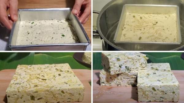 Chuẩn bị một cái khuôn, bạn cho đậu hũ sau khi trộn vào khuôn rồi nén vừa chặt. Sau đó, bạn cho khuôn đậu hũ vào trong xửng nước sôi để hấp trong 20 phút ở lửa trung bình.