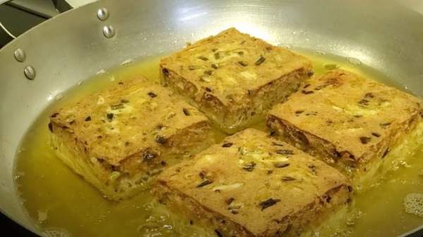 Chuẩn bị một chảo dầu sôi, bạn cho từng miếng đậu hũ vào chiên ở lửa nhỏ đến khi miếng đậu hũ vàng đều 2 mặt thì vớt ra cho ráo dầu.