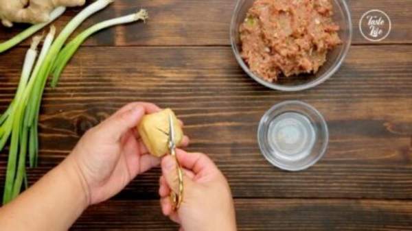 Bước 2: Trộn đều thịt lợn xay, tôm băm cùng với các nguyên liệu: gừng, hành lá, rượu, xì dầu, đường, dầu mè và hạt tiêu trắng.