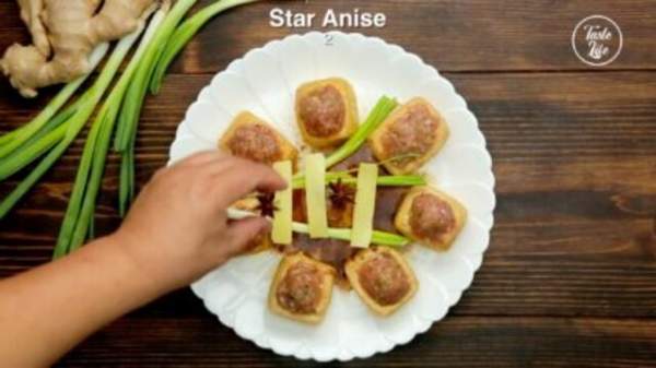 Bước 6: Xếp các miếng đậu nhồi thịt lên trên đĩa, rưới rượu nấu ăn, rắc một chút muối, bột ngũ vị hương lên, sau đó cho xì dầu, 3 lát gừng, 3 cây hành lá và bông hồi lên trên.