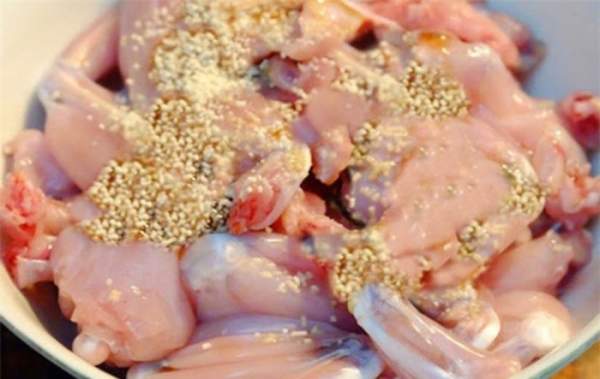 Thịt ếch khi mua về, các bạn đem rửa sạch, bóp với chút muối và rượu trắng khoảng 2 phút để loại bỏ hết mùi tanh, nhớt của ếch.