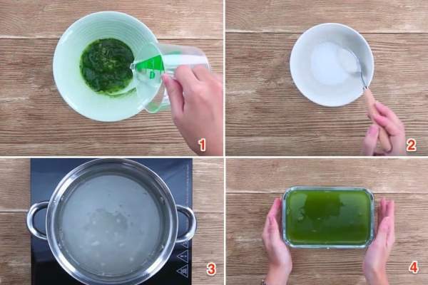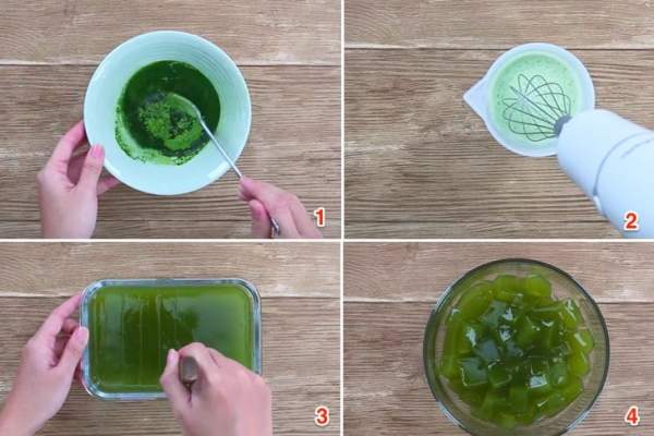 Cho hỗn hợp bột jelly vào nồi cùng 500 ml nước lọc và phần bột matcha đã hoà tan với nước ấm. Nấu cho hỗn hợp sôi, vừa nấu vừa khuấy đều cho bột jelly tan hết. Sau đó, cho hỗn hợp vào khuôn và chờ đông lại.