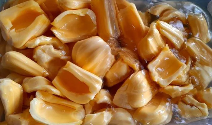 Cho hết lượng mít đã bóc vào ngâm. Việc ngâm này giúp mít sạch mủ, thấm vị và ngon hơn đấy. Ngâm mít trong 10 – 15 phút rồi vớt ra để ráo mít.
