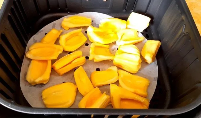 Đặt giấy nến vào nồi chiên, sau đó xếp mít vào nồi chiên. Đừng xếp quá dày, mít sẽ khó khô và kém giòn nhé.