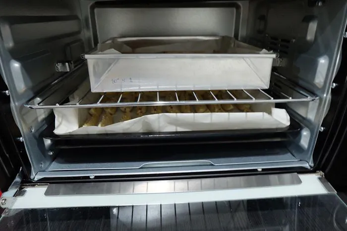 Khi chuối chín vàng đều thì lấy khay chuối ra.