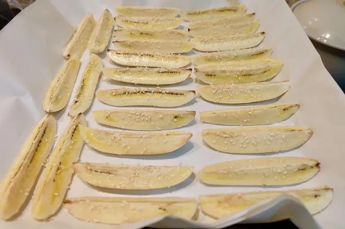 Chuối bóc bỏ vỏ sau đó cắt làm 4 theo chiều dọc. Xếp chuối vào khay đã lót giấy nướng.
