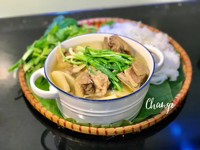- Thành phẩm với nước dùng béo ngậy, thơm của vịt, măng và các gia vị kết hợp lại với nhau.