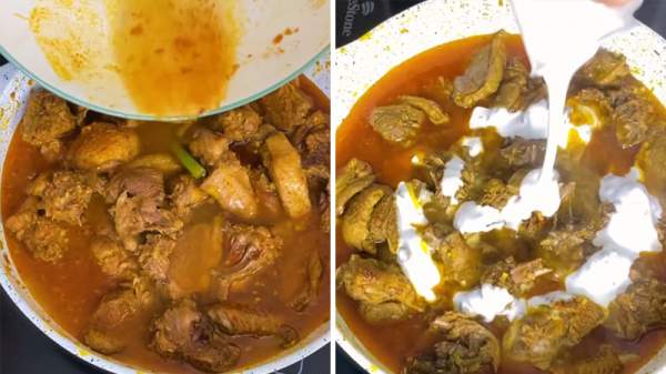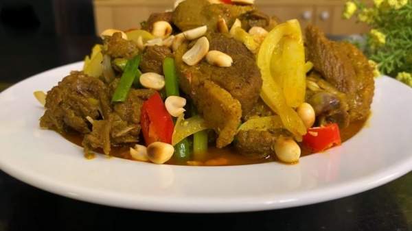 - Nước trong chảo sôi, nước dừa cạn bớt thì bạn cho 100ml nước cốt dừa vào, mở lửa lớn rồi nêm nếm lại xem đã vừa ăn chưa, nếu đã vừa miệng thì thêm hành tây cắt múi cau, gừng cắt sợi vào chảo, đảo đều rồi tắt bếp, rắc lên tí đậu phộng.
