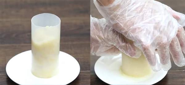 Bạn cho xôi vào khuôn và ép chặt, sau đó lấy xôi ra cho vào túi nilon và để trong ngăn đá tủ lạnh tầm 4 - 5 tiếng thì lấy ra, cắt xôi theo hình tròn để chiên.
