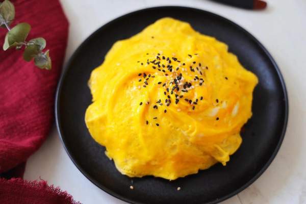 Bước 8: Không cần đợi cho đến khi nó chín hoàn toàn mà vẫn còn chất lỏng trứng chưa chín trên bề mặt. Sau đó, cho trứng lên trên cơm, rắc chút vừng rang và hành lá thái nhỏ lên trên. Món cơm chiên đã sẵn sàng, vừa ngon vừa đẹp mắt, ai cũng muốn được thưởng thức ngay lập tức.