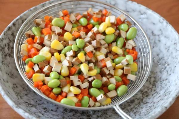 Bước 4: Thêm các món phụ: Đậu xanh, ngô ngọt, xúc xích, cà rốt vào và đảo đều.