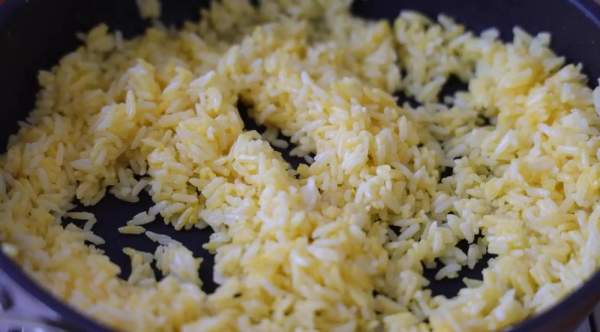 Bước 3: Đun nóng dầu trong nồi, cho cơm vào đảo cho đến khi các hạt cơm săn lại.