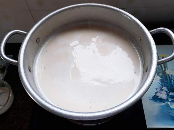 Bước 4: Ngâm sữa gạo trong khoảng 10 phút rồi đem đun ở mức lửa nhỏ nhất. Khi nồi sữa gạo bắt đầu có dấu hiệu lăn tăn sôi thì tắt bếp.
