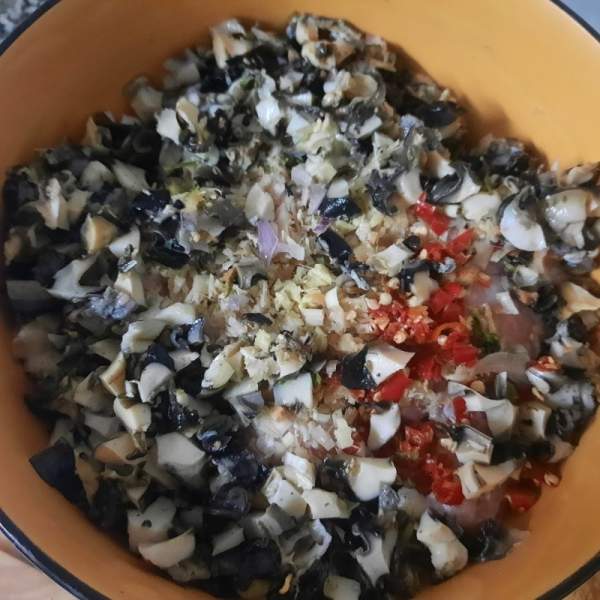 - Băm nhuyễn mộc nhĩ, 3 nhánh sả, 1 củ hành tím, 1 củ gừng, 1 quả ớt cho vào hỗn hợp trên rồi cho thêm 1 muỗng canh đường, 1 muỗng canh tiêu xay, 1 muỗng canh nước mắm, trộn đều.