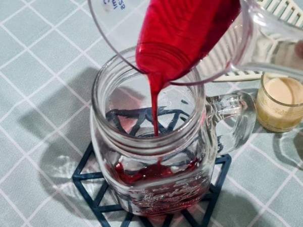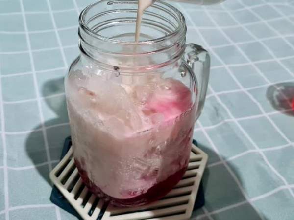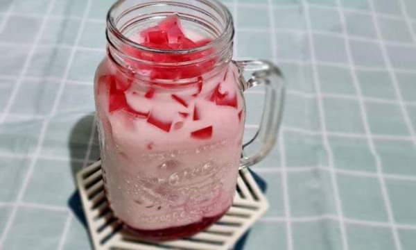 - Đổ sữa tươi vào, thêm màu thạch hồng là đã có ly đồ uống đẹp mắt như ngoài hàng.