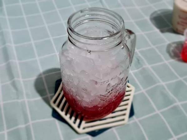 - Tất cả các nguyên liệu đã sẵn sàng, từ từ múc đá vào ly, thêm một ít siro dâu.