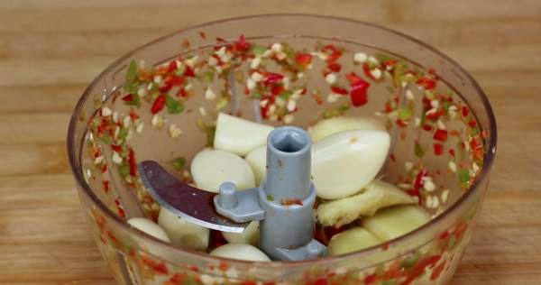 Bước 3: Ngâm gừng một lúc sau đó rửa sạch, cắt lát mỏng, để ráo nước. Tỏi bóc vỏ, băm nhỏ, sau đó cho tất cả gừng, tỏi vào máy xay nhuyễn rồi để ra bát ớt trước đó.