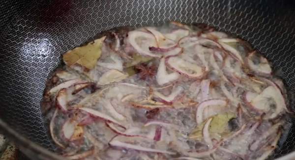 Bước 5: Chuẩn bị một chiếc đĩa nhỏ, cho một ít hạt tiêu, hoa hồi và lá nguyệt quế lên trên đĩa, sau đó cho phần hành tây thái nhỏ vào đĩa.