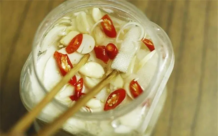 Sau đó bạn cho hỗn hợp măng cùng với tỏi, ớt mắc mật vào trong lọ thủy tinh, rồi đổ hỗn hợp dấm vào. Đổ dấm sao cho măng ngập trong dấm.