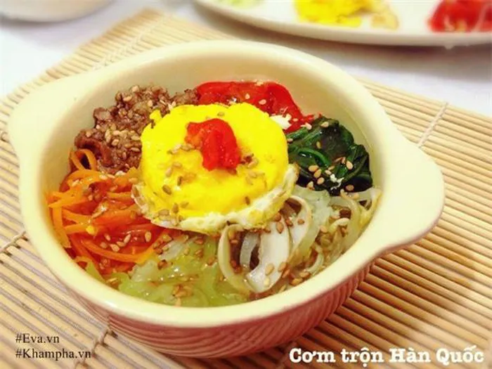 Cho ớt chuông, giá đỗ, cải bó xôi, thịt bò, trứng, su su và 1 ít nấm. Rau củ thì xào sẽ thơm nhưng nếu muốn hạn chế dầu mỡ thìluộc rồi rắc vừng. Bò ướp 1 lúc bột tỏi rồi xào. Sau khi các nguyên liệu chín thì xúc cơm ra bát và trình bày cho đẹp mắt.