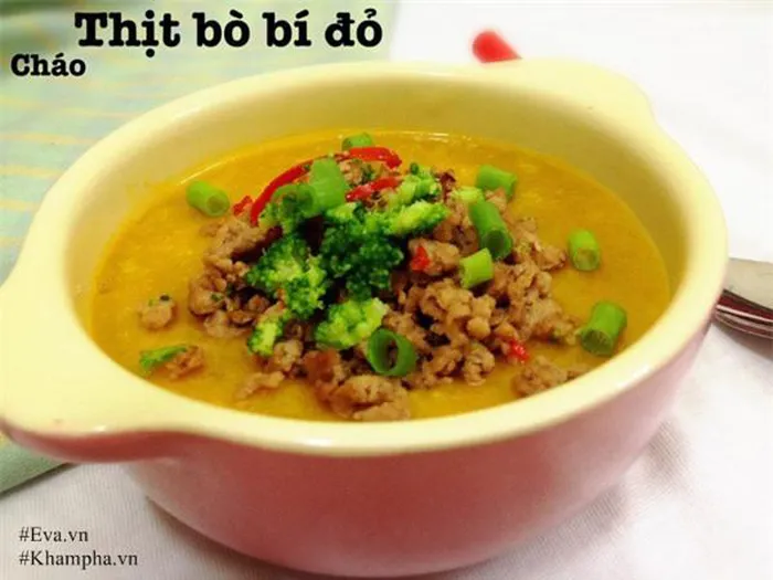 - Cháo chín múc ra bát. Xúc thịt bò lên trên.