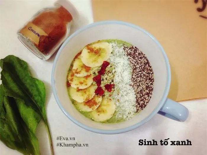 Yến mạch nấu chín, đậu lăng đỏ hấp chín. Mẹ cho chuối, yến mạch, sữa chua, cải bó xôi (luộc sơ sơ). Xay chung mọi thứ lên