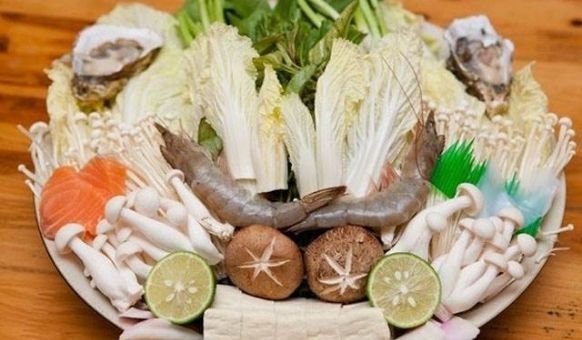 Lần lượt cho các nguyên liệu như mực, phi lê cá, tôm, nghêu, các loại rau ăn kèm, cuối cùng là cho thịt bò và nấm kim châm vào, đợi cho các nguyên liệu chín là có thể thưởng thức rồi.