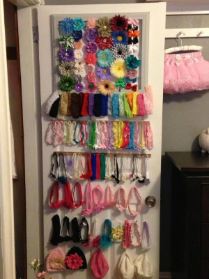 Với các nàng, mua sắm bao nhiêu cặp tóc, băng đô, chun buộc... đều là không đủ nên sẽ rất tốn diện tích nếu bạn ở bàn trang điểm. Hãy thiết kế một chiếc giá treo phía sau cánh cửa (hoặc đơn giản là đóng đinh lên đó), bạn đã có chỗ để phụ kiện tóc tiện lợi. Bằng cách sắp xếp này, bạn dễ dàng chọn và mix phù hợp với từng bộ đồ.