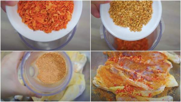 Bạn cho 2 muỗng canh ruốc sấy, muối tôm vào máy xay để xay nhuyễn 2 gia vị này. Sau đó bạn chà xát lên gà để thấm vị và cho tiếp 1 muỗng canh tỏi ớt băm, 1 muỗng canh sả băm vào.