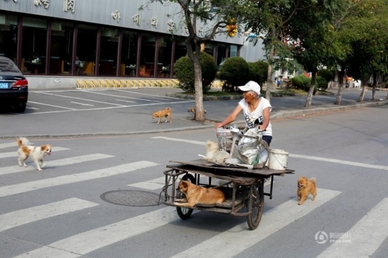 Năm nay bà Vương đã 73 tuổi nhưng hàng ngày vào lúc 2 giờ bà lại đạp chiếc xe 3 gác cũ kĩ chở 20 chú chó đến một trạm xe bus ở thành phố Thẩm Dương.