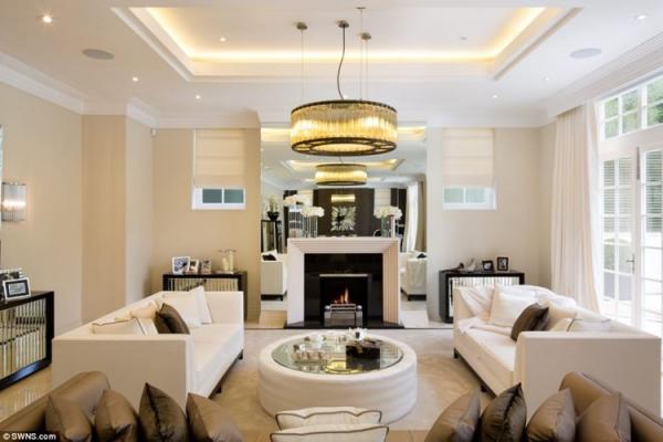 Một phòng khách với cửa sổ kính nhìn ra khu vườn phía sau. Căn phòng được thắp sáng bởi hai chiếc đèn trần trị giá 10.000 USD/chiếc.