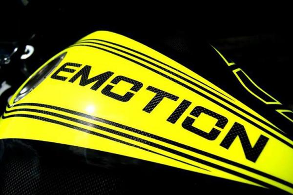 Bình xăng nổi bật được ốp carbon của Emotion đi kèm các hoạ tiết màu vàng chanh được thiết kế cách điệu.