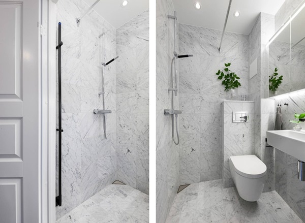 Phòng tắm nhỏ xinh được chọn lựa vòi hoa sen, chậu rửa mặt và hệ thống đá ốp tường giúp không gian thư giãn mỗi ngày thêm thông thoáng và mát mẻ.