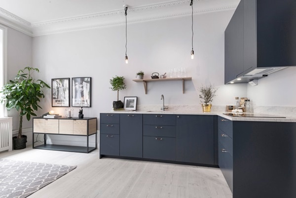 Để cân bằng màu sắc với không gian tiếp khách, gia chủ đã lựa chọn màu xanh đậm làm màu nhấn cho không gian nấu nướng. Màu ghi sáng vẫn được lựa chọn để tăng thêm nét đẹp hài hòa và hiện đại cho căn bếp nhỏ.