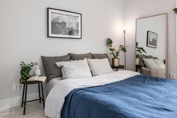 Căn hộ tuy nhỏ nhưng gia chủ vẫn khéo léo dành một phần diện tích để thiết kế không gian nghỉ ngơi riêng tư với các không gian chức năng khác trong nhà. Vẫn là sự kết hợp giữa xanh đậm và ghi, xanh đậm cho giường ngủ và ghi sáng cho tường nhưng căn phòng nghỉ ngơi vẫn toát lên vẻ đẹp tinh tế, dịu dàng và bình yên.