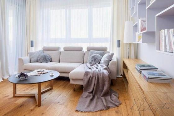 Căn hộ này là một gợi ý hữu ích cho những người ưa thích phong cách đơn giản, thanh lịch, với một phòng ngủ rộng rãi, đầy đủ phòng khách, nhà bếp, phòng tắm. Vẻ đẹp thực sự của căn hộ nằm ở việc tinh tế trong cách sử dụng gam màu xanh lam dịu mát, kết hợp với những tông màu nền trung tính, chất liệu gỗ tự nhiên thân thiện, đem đến cảm giác dễ chịu, bình yên. Không gian giữa các phòng luôn có sự chuyển tiếp uyển chuyển nhờ cách sử dụng nội thất, màu sắc.