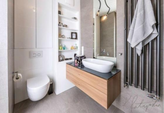 Nét thanh lịch của căn hộ được chuyển đổi đến khu vực phòng tắm với chất liệu đá thô, xám. Mọi sắp xếp trong khu vực nhà tắm cũng được duy trì rất trật tự, ngăn nắp. Tuy nhiên, bồn rửa có lẽ là nét độc đáo hơn cả với thiết kế mềm mại, nằm trên đỉnh của tủ gỗ kiểu dáng đẹp tựa như một ngăn kéo.