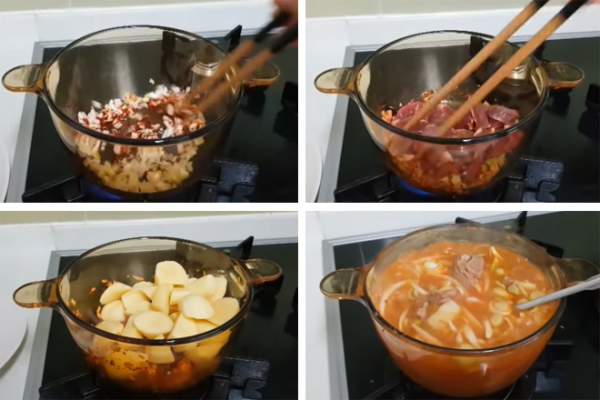 Cho thịt bò vào đảo qua 1-2 phút. Bạn cho tiếp khoai tây vào đảo vài phút. Đổ nước dùng hoặc nước lọc vào bằng mặt khoai và thịt. Đậy vung, nấu sôi.