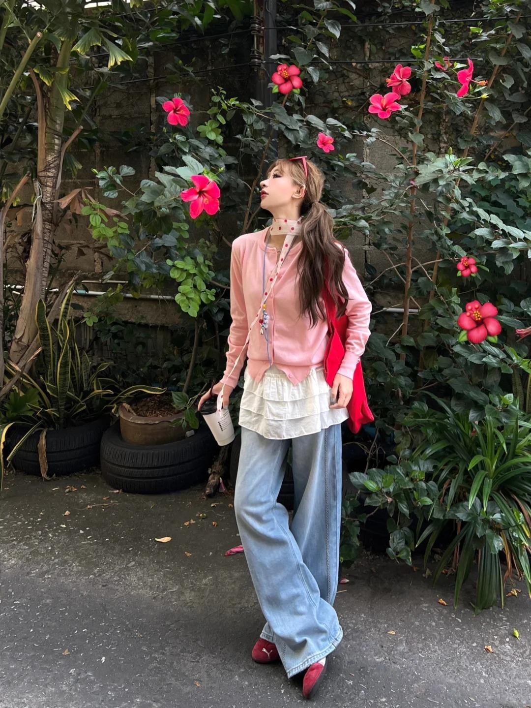 Áo màu hồng kết hợp quần jeans là combo trông vừa mềm mại vừa nữ tính.