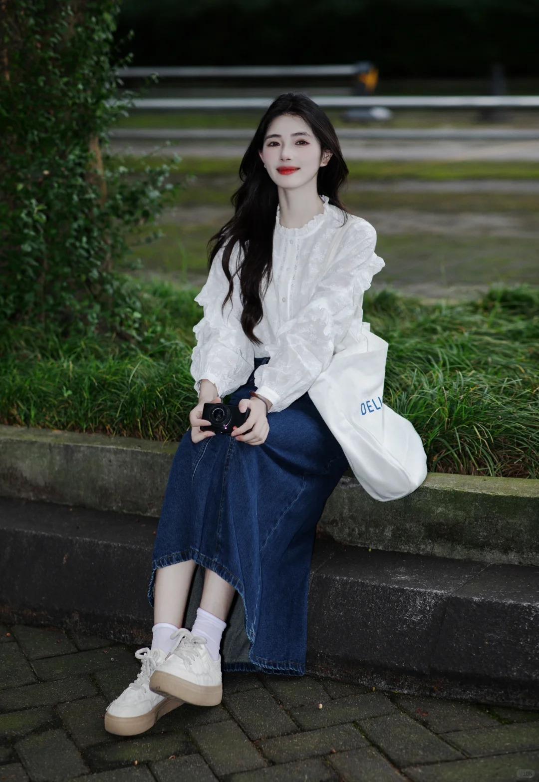 Sự kết hợp giữa áo sơ mi và váy midi jeans cùng giày thể thao gợi lên vẻ ngoài cá tính và thu hút.