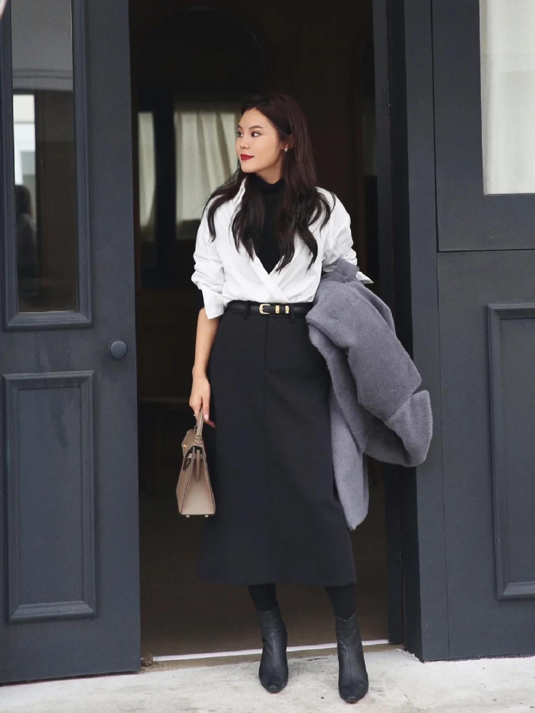 Còn chị em yêu thích thanh lịch, hiện đại, phù hợp cho nhiều dịp khác nhau từ đi làm cho đến những buổi cà phê cuối ngày thì sơ mi trắng và chân váy midi kết hợp cùng giày boots cao gót là sự kết hợp không làm nàng thất vọng. Trong trường hợp chị em theo đuổi phong cách tinh giản thì hãy chọn bộ suit màu pastel như xanh baby, beige, hồng nhạt… mix cùng giày mule thay vì những gam màu tối truyền thống để tạo cảm giác mềm mại hơn.