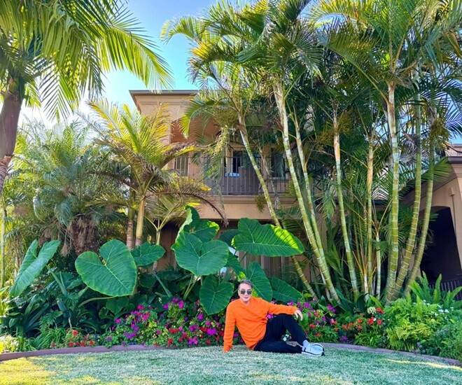 Đàm Vĩnh Hưng thư giãn trong khu vườn rực rỡ sắc hoa, nổi bật với bụi ráy tai voi xanh um. Lá cây lớn và dày, xen giữa hàng dừa cảnh, tạo nên khung cảnh nhiệt đới sống động như resort.