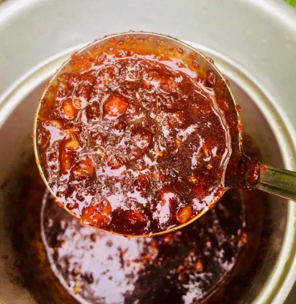 - Phi thơm hành tỏi vừa băm với 2 thìa dầu ăn, đổ phần hỗn hợp vừa trộn trên vào khuấy đều, đến khi hỗn hợp sốt sệt lại thì tắt bếp.
