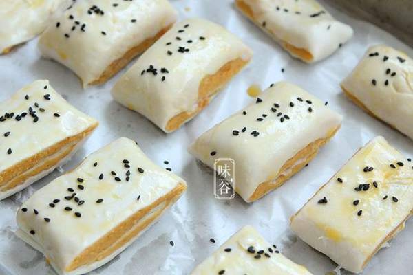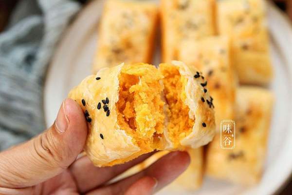 2 củ khoai lang, 1 quả trứng, sữa, đường, vỏ bánh mua sẵn, mè rang, phô mai.