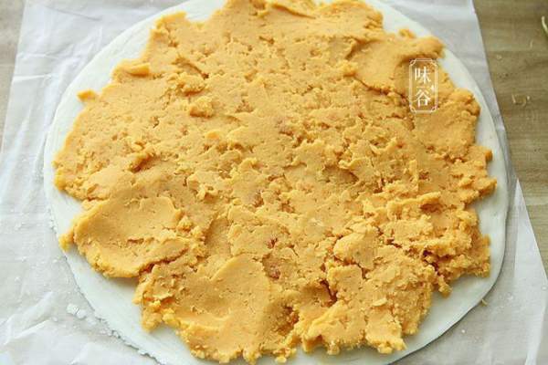 Trải vỏ bánh ra, cán mỏng, dàn đều khoai lang lên trên, rắc phô mai mozzarella vào giữa.
