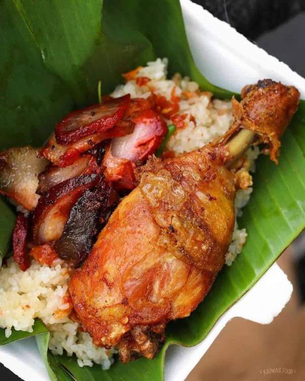 Hộp xôi bao gồm gạo nếp dẻo thơm, thêm mấy miếng xá xíu nữa, rồi đùi hoặc cánh gà chiên giòn rồi rưới lên một thứ nước sốt đặc biệt, hòa vị cùng mỡ hành và tép khô mặn ngọt thật hấp dẫn. Tất cả tạo nên món xôi khiến ai cũng không thể cầm lòng, đặc trưng của kiểu ăn xôi mặn miền Nam.