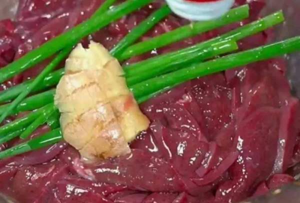 Bước 2: Gan heo tươi có mùi tanh nồng, thêm một ít gừng, hành và rượu trắng vừa đủ để khử mùi tanh, dùng tay trộn đều rồi để nguội trong vòng 10 phút.