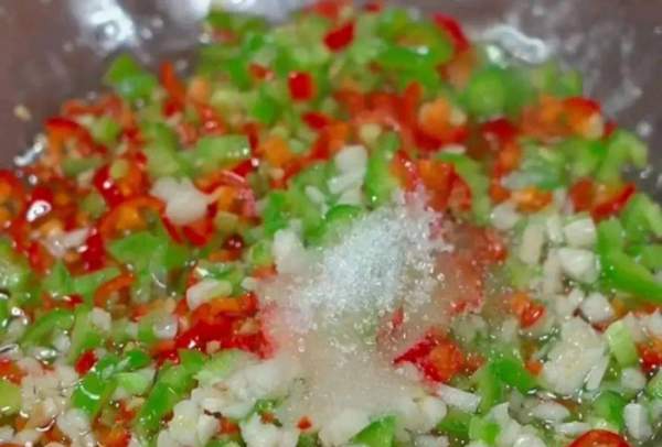 Bước 5: Chuẩn bị ớt xanh và ớt đỏ rồi băm thành hạt lựu, sau đó cho tỏi băm nhuyễn vào phi thơm cùng dầu nóng. Tiếp theo, thêm muối, tinh chất gà, đường để trung hòa vị cay, nước tương nhạt để tăng hương vị.