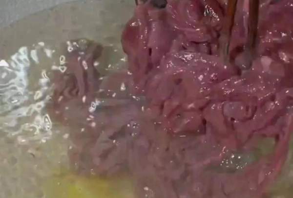 Bước 7: Đun sôi nước trong nồi, cho một ít gừng thái sợi và rượu nấu ăn vào để khử mùi tanh. Sau khi nước sôi thì tắt bếp, cho gan heo vào nồi đảo đều, đợi hỗn hợp bên ngoài gan heo đông lại thì vặn lửa nhỏ và từ từ đảo vài lần cho đến khi gan heo săn lại.